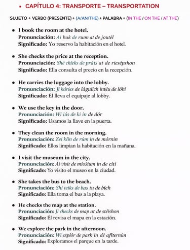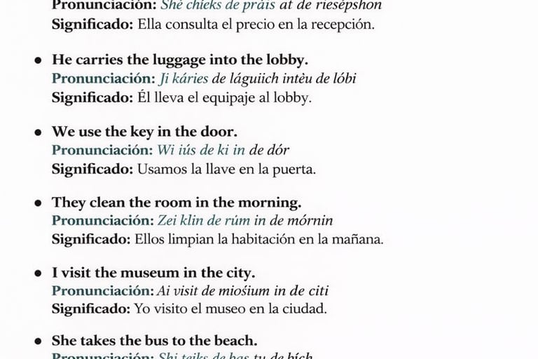 Aprende la fórmula completa de frases:Sujeto + Verbo (presente) + Artículo + Objeto + Preposición + Lugar (+ Adverbio / Explicación corta)